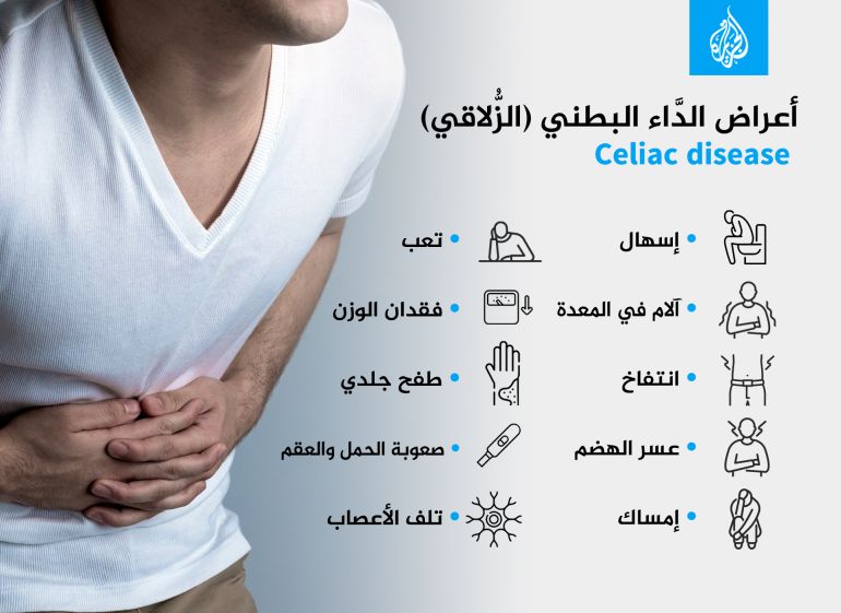 The ventricular disease (celiac) is the most famous types of autoimmune diseases associated with gluten, and this disease causes damage to the digestive system, which leads to a group of symptoms of the digestive system such as diarrhea, bloating and stomach pain, in addition to fatigue, weight loss and rash.